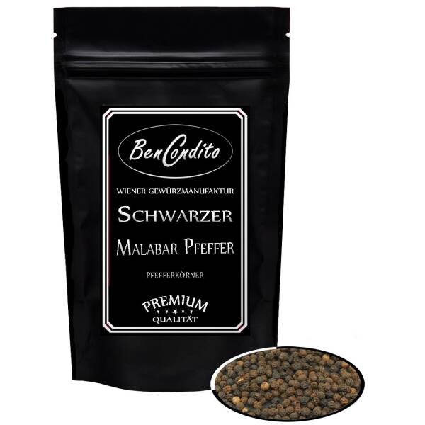 Der schwarze Malabar Pfeffer kommt direkt von der indischen Pfefferküste, wo er unter idealen klimatischen Bedingungen wächst. Der Pfeffer wird aus den unreifen (grün) bis knapp vor der Reife (gelb-orange) stehenden, durch Trocknen runzlig und schwarz gewordenen Früchten des Piper nigrum gewonnen. Er hat ein warmes, intensives Aroma mit einer angenehmen Schärfe und einen leichten grünlichen Schimmer, der von seiner langen Reifezeit zeugt.